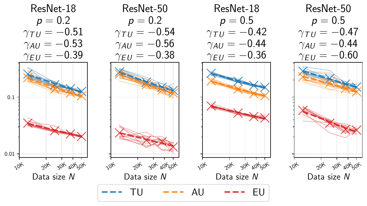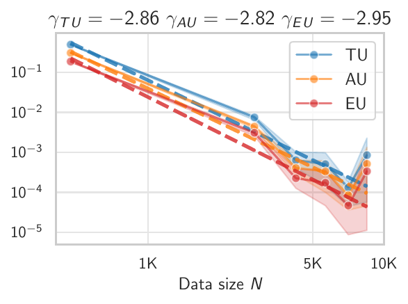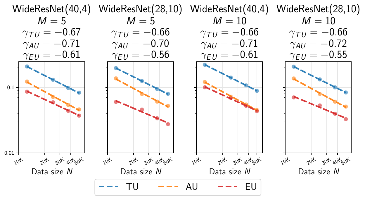 Scaling Patterns: We empirically demonstrate that predictive uncertainties evaluated on in- and out-of-distribution data follow power-law trends with the dataset size. This allows us to extrapolate to large dataset sizes and to identify data regimes where UQ approaches remain relevant to characterize the diversity of the ensemble to a given numerical precision.